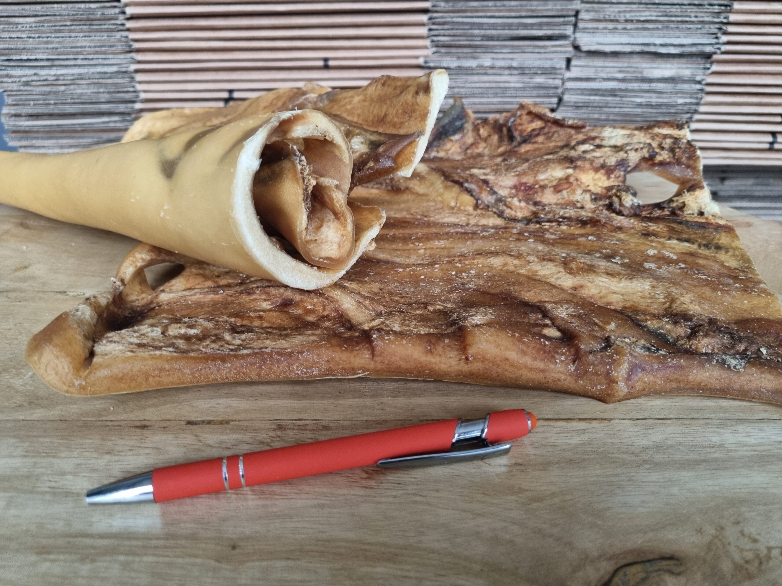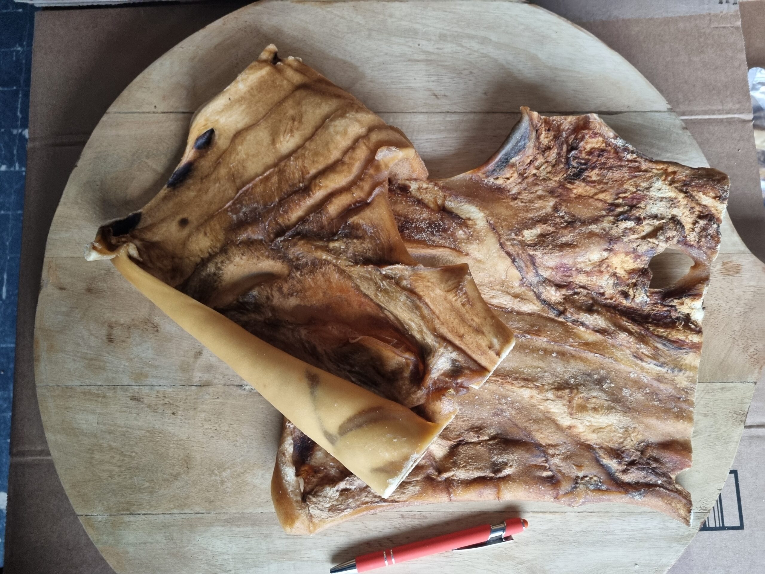 Kophuid plaat van de rund heeft verschillende afmeting. Eén plaat kan tussen de 200-500 gram wegen. Ze zijn ook verschillend in dikte, maar wel breed. De hond zal flink moet kauwen op deze plaat.