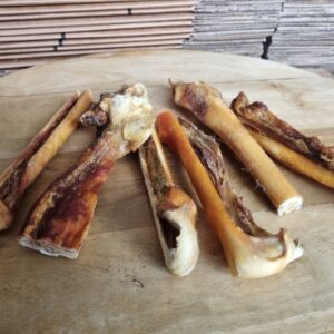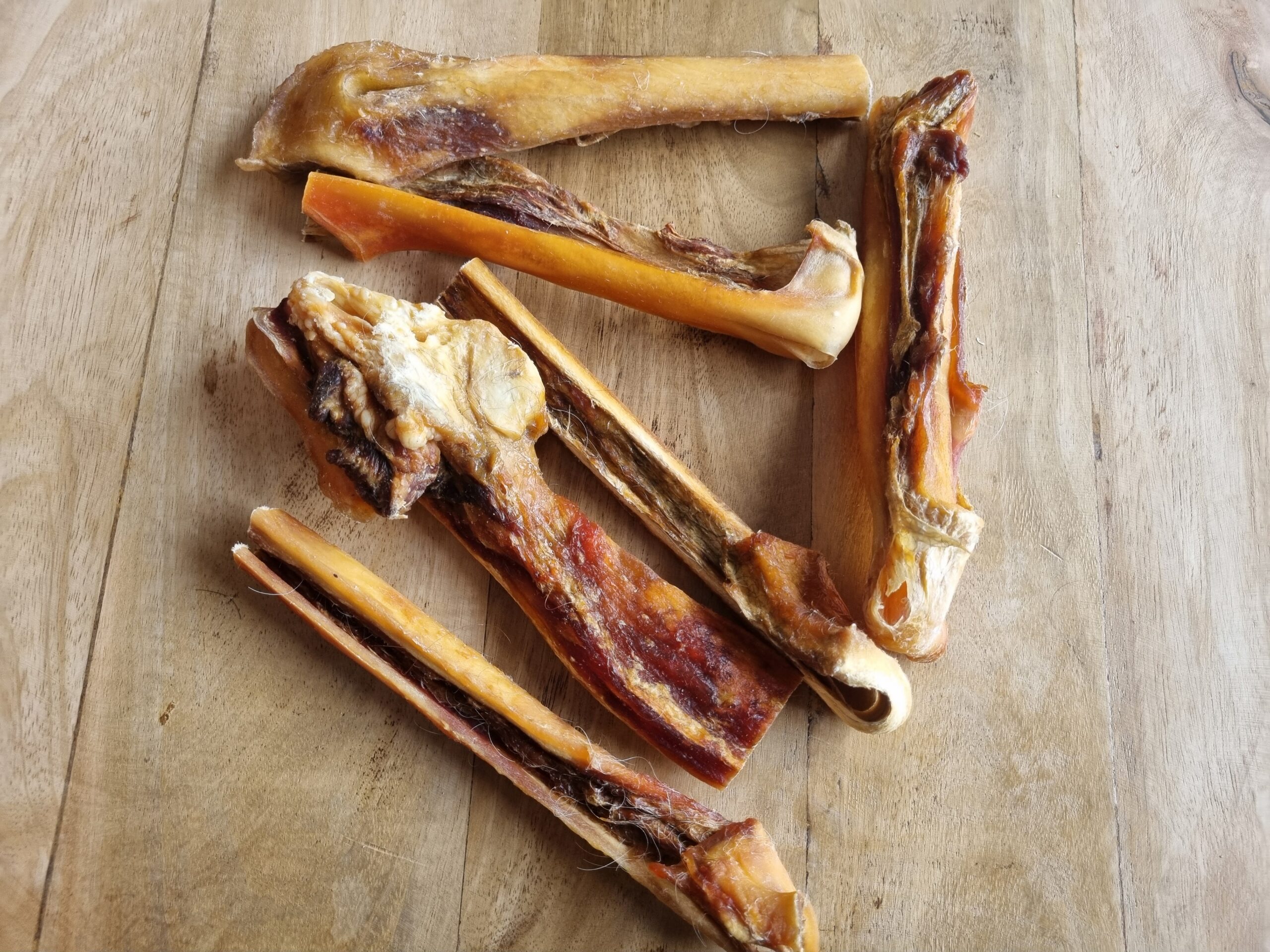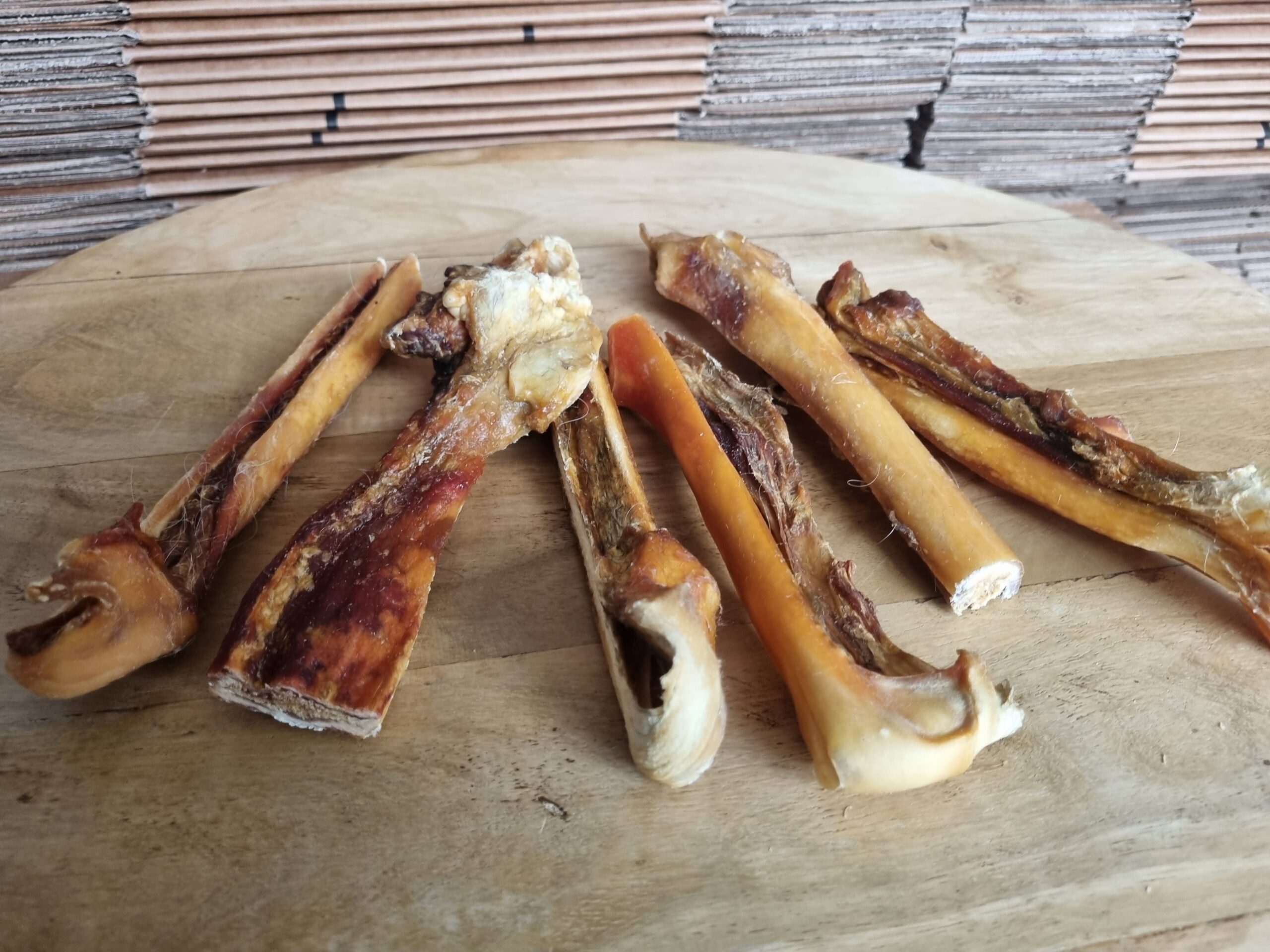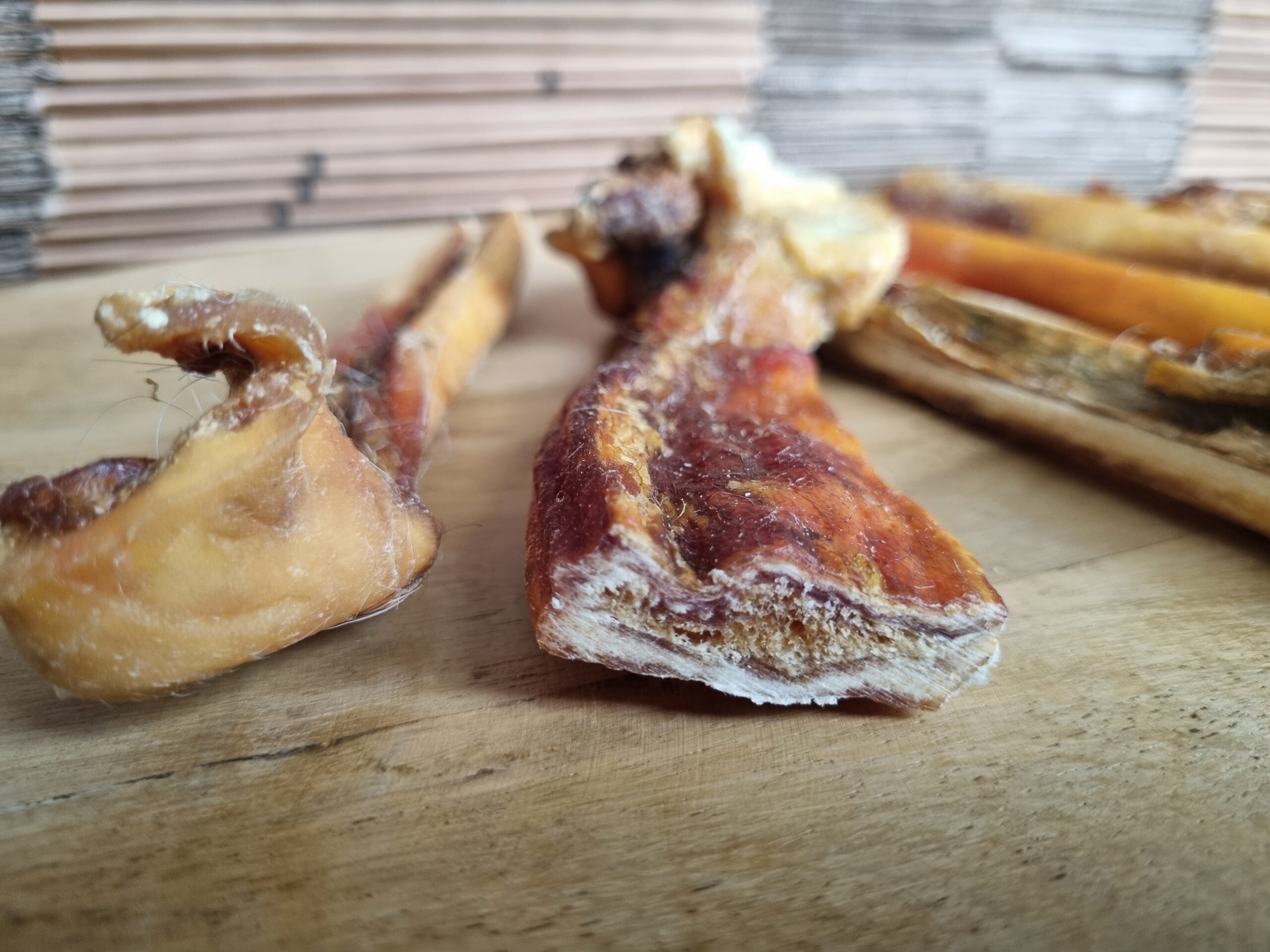 Geen afvalstukken van de huid van de rund! Deze noemen ze meestal runderhuidsticks en die zijn dan ook veel dunner.