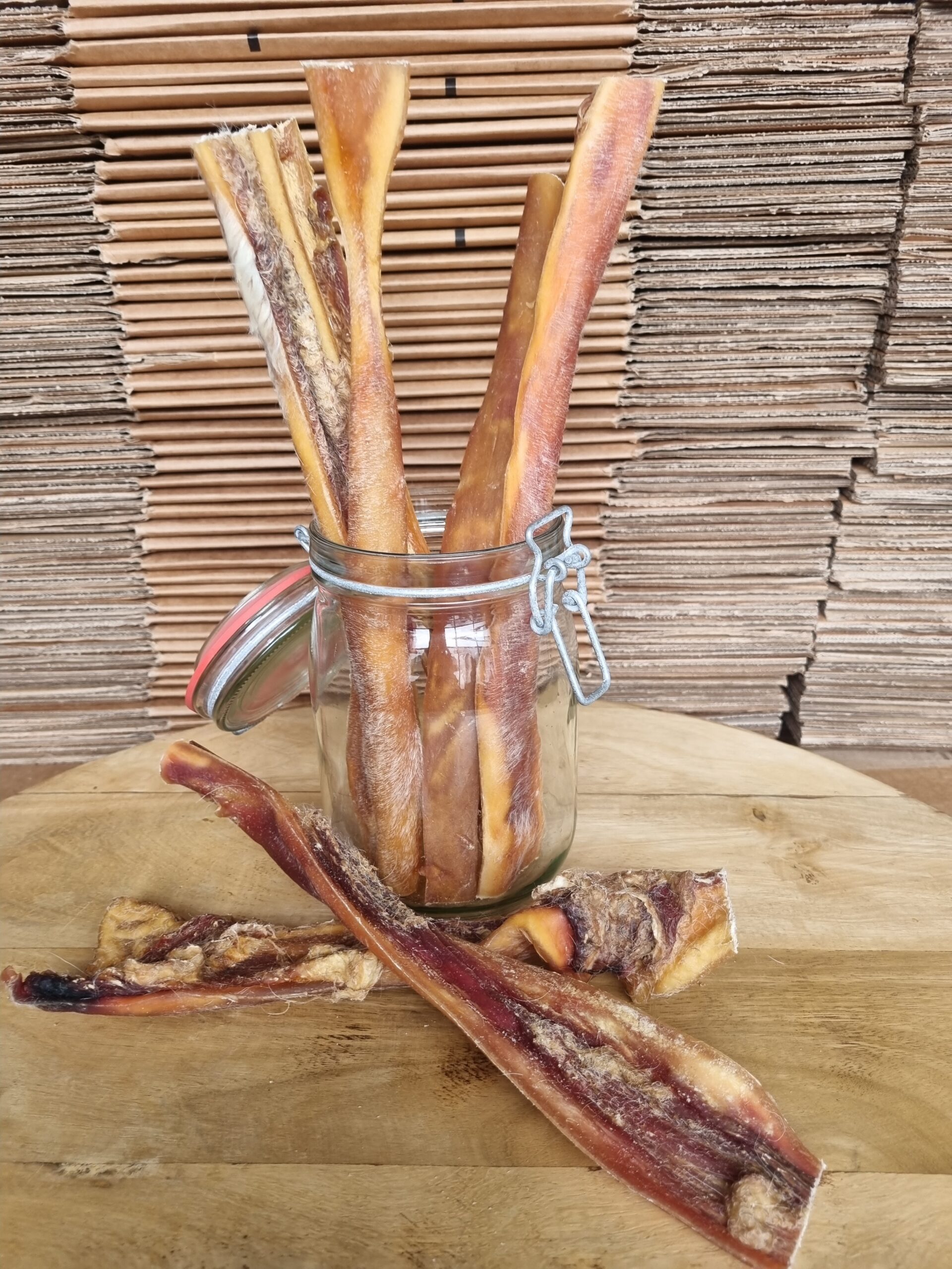 Geen afvalstukken van de huid van de rund! Deze noemen ze meestal runderhuidsticks en die zijn dan ook veel dunner.